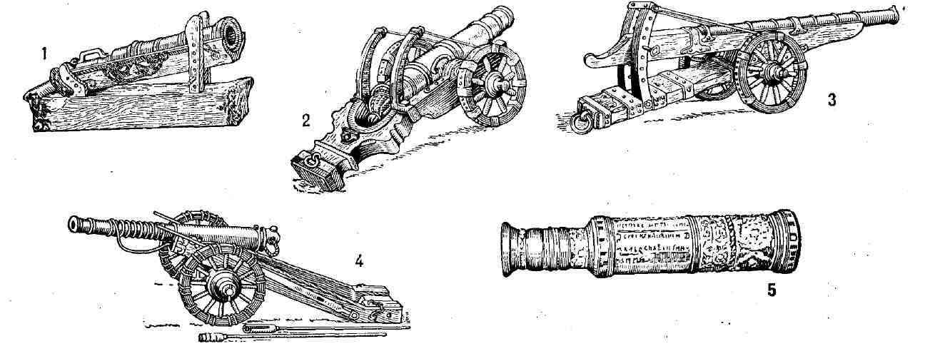 Орудия 14 - 17 вв.: 1 - бомбарда конца 14 в.; 2 - тяжёлое орудие 15 в.; 3- длинная французская серпантина 15 в.) 4 - большая французская кулеврина 17 в.; 5 - гафуница 1542. зарождение полевой А. (на Руси - малый наряд). В странах Зап. Европы А. как самостоятельный вид оружия сложилась во 2-й половине 14 в., а на Руси - в конце 14 - начале 15 вв. В 15- 16 вв. происходит укрепление экономики гос-ва, дальнейшее развитие вооружения войск, приобретается боевой опыт в применении А. Все это приводит к преобразованию А. из вида оружия в род войск (наряду с пехотой и конницей). Страны Востока (Индия, Китай, Иран и др.) к этому времени значительно отставали в развитии А. от др. стран. В 16 в. повсюду широкое распространение получают двухколёсные лафеты. В Рус. гос-ве придание стрелецким полкам орудий положило начало полковой артиллерии. В 16-17 вв. зарождается арт. наука, появляются первые соч. по А. итальянца Н. Тартальи "О новой науке" (1534), испанца Д. Уффано "Трактат об артиллерии" (1613) и О. Михайлова "Устав ратных пушечных и других дел, касающихся до воинской науки" (1621). В 17 в. во всех передовых в экономич. отношении странах происходит дальнейшее развитие А. Широкое распространение получила отливка орудий и снарядов из чугуна, наметилась стандартизация в их изготовлении, возросла роль А. в войнах. Так, в освободит. войне рус. народа с польско-швед. интервентами, особенно в бою под Добрыничами (1605), А. сыграла важную роль в успехе рус. войск. В войнах этого периода зарождаются элементы использования А. в линейных боевых порядках войск. В 60-х гг. 17 в. в России были изготовлены нарезные орудия, канал ствола к-рых запирался ввинчивающимся вин-градом (металлич. цилиндр с резьбой), и гладкостенные орудия с механич. клиновым затвором. Созданием этих орудий рус. пушечные мастера (Ермола Фёдоров, Андрей Нейдгарт и др.) внесли выдающийся вклад в усовершенствование А. В странах Зап. Европы первые сведения о наличии нарезных орудий относятся к 1676 (Гаага) и 1691 (Нюрнберг). В нач. 18 в. Пётр I, используя достижения в развитии А. европ. армий, коренным образом преобразовал рус. А. Был установлен строгий порядок изготовления материальной части по чертежам, введены единая арт. шкала и весовое наименование орудий (см. Калибр), заряды помещались в холщовые картузы, что способствовало повышению скорострельности и меткости стрельбы. А. была разделена на полковую, полевую, осадную и крепостную. Для поддержки конницы создаётся спец. конная и конно-горная А. (гл. обр. вьючная). Все эти преобразования выдвинули рус. А. на уровень наиболее развитых в арт. отношении армий Европы. Дальнейшее развитие А. в России в сер. 18 в. связано с деятельностью генерал-фельдцейхмейстера П. И. Шувалова; были введены новые системы орудий - в 1753 так наз. "секретные гаубицы", в 1757 - единороги, просуществовавшие на вооружении рус. А. более ста лет; конструкция их была заимствована мн. европ. армиями. Благодаря высоким боевым свойствам вновь созданных ору- дий рус. артиллеристы во время Семилетней войны в сражении при Пальциге (1759) впервые применили метод стрельбы через голову своих войск и положили начало новому, наиболее передовому принципу тактич. применения А. Большое влияние на развитие передовых методов использования А. в бою и особенно в организации её взаимодействия с пехотой оказали крупнейшие рус. полководцы П. А. Румянцев, А. В. Суворов и, М. И. Кутузов