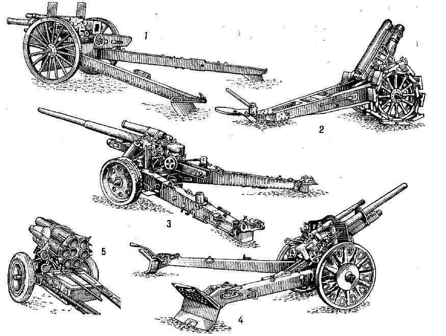 Образцы иностранных орудий, применявшиеся в 1-й мировой (1914 -18) и 2-й мировой (1939 - 45) войнах; 1 - 105-мм гаубица (США); 2 - 210-мм осадная гаубица Крупна (Германия); 3 - 105-мм пушка (Германия.; 4 - 105-мм лёгкая гаубица (Германия); 5 - немецкий 6-ствольный миномёт. стрельность, углы горизонтального и вертикального обстрела и т. д. В сов. А. в нач. 30-х гг. такой модернизации подверглись семь осн. образцов арт. орудий. Однако модернизация имевшихся типов орудий не могла решить всех вопросов, связанных с коренным улучшением арт. вооружения. Поэтому в Сов. Союзе, а также в ряде стран Зап. Европы, США и Японии проводилась большая работа по созданию новых орудий лёгкой и тяжёлой А., противотанк. и зенитных пушек и орудий большой мощности. Построенная в годы предвоен. пятилеток мощная социалистич. пром-сть позволила реконструировать старые и построить новые арт. заводы, способные производить орудия и миномёты всех видов и типов - от лёгких противотанк. пушек до орудий большой и особой мощности. К нач. Вел. Отечеств. войны 1941-45 в сов. А. насчитывалось 67 тыс. орудий и миномётов (без 50-мм миномётов) в основном новых образцов. На вооружение Сов. Армии были приняты новые 45- и 76-мм пушки, 122- и 152-мм пушки, гаубицы и гаубицы-пушки, 203-мм и 305-мм гаубицы и 280-мм мортиры, 82- и 120-мм миномёты, 37-, 76- и 85-мм зенитные пушки. Новыми орудиями были вооружены танки, самолёты и боевые корабли флота. Сов. учёные и работники пром-сти создали накануне войны первые образцы полевой реактивной А., к-рые по своему качеству превосходили реактивную технику всех др. стран. Значит. вклад в создание высококачественного арт. вооружения внесли конструкторские бюро, возглавляемые В. Г. Грабиным, И. И. Ивановым, Ф. Ф. Петровым, Б. И. Шавыриным и др. Большое внимание уделялось подготовке кадров. Арт. академия им. Ф. Э. Дзержинского, 28 арт. училищ и большое число курсов в основном удовлетворяли возросшие потребности в командных и технич. кадрах. А. капиталистич. гос-в - участников 2-й мировой войны по количеств. составу и по своему качеству уступала сов. А. Фаш. Германия имела наиболее сильную А. по сравнению с др. капиталистич. странами, но вследствие умаления роли А. в войне и преувеличения роли авиации и танков внимание к развитию А. было недостаточным и она фактически была сведена к второстепенному роду войск. Первые же месяцы войны против СССР показали нем.-фаш. командованию, что недооценка роли А. была его большой ошибкой, но все усилия, направленные на увеличение мощи А. в ходе войны, желаемых результатов не дали. Наиболее массовыми видами А. армий капиталистич. гос-в во 2-й мировой войне были: в Германии - 37-, 50-, 75-, 105- и 150-мм пушки, 105- и 150-мл гаубицы; в Великобритании - 40-, 127- и 152-мм пушки, 94- и 152-мм гаубицы; во Франции - 47-, 75-, 105- и 155-мм пушки и 155-мм гаубицы; в США - 35- и 155-мм пушки, 105- и 155-мм гаубицы; в Японии - 37-, 75- и 105-мм пушки и 105-мм гаубицы. Миномётное вооружение в этих странах было представлено в основном миномётами малого и среднего калибра (от 47-мм до 107-мм). Дальнейшее развитие сов. А. связано с Вел. Отечеств. войной 1941-45, в ходе к-рой А. наряду с пехотой и танками являлась одним из основных родов сухопутных войск, была их гл. огневой ударной силой и своими боевыми делами по праву заслужила название "бог войны". В зависимости от складывающейся на фронте обстановки, задач, стоявших перед Сов. Армией, и материальных возможностей страны изменял