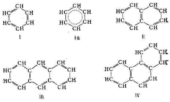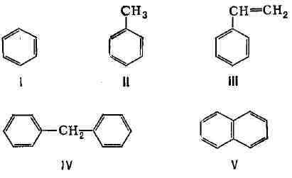 (VIII) и др. Ароматич. свойствами обладают и нек-рые неорганич. соединения, напр. боразол (IX), фосфонитрилхлорид (X). Сравнит. ароматичность бензоидных и небензоидных соединений, проявляющаяся в способности вступать в реакции электрофильного замещения, соответствует ряду; анион VII > пиррол > бензол -> пиридин > тропилий; способность к реакциям нуклеофильного замещения изменяется в обратном порядке. Лит.; Карер П., Курс органической химии, пер. с нем., Л., 1960. Я. Ф. Комиссаров. АРОМАТИЧЕСКИЕ УГЛЕВОДОРОДЫ, органич. соединения, состоящие из углерода и водорода и содержащие бензольные ядра. Простейшие и наиболее важные представители А. у.- бензол (I) и его гомологи: метилбензол, или толуол (II), диметилбензол, или ксилол, и т. д. К А. у. относятся также производные бензола с ненасыщенными боковыми цепями, напр. стирол (III). Известно много А. у. с неск. бензольными ядрами в молекуле, напр. дифенилметан (IV), дифенил С6Н5-С6Н5, в к-ром оба бензольных ядра непосредственно связаны между собой; в нафталине (V) оба цикла имеют 2 общих атома углерода; такие углеводороды наз. А. у. сконденсированными ядрами.