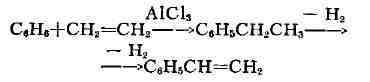 Осн. источником получения А. у. служат продукты коксования кам. угля. Из 1 т кам.-уг. смолы можно в среднем выделить 3,5 кг бензола, 1,5 кг толуола, 2 кг нафталина. Большое значение имеет произ-во А. у. из нефтяных углеводородов жирного ряда (см. Ароматизация нефтепродуктов). Для нек-рых А. у. имеют практич. значение чисто синте-тич. методы. Так, из бензола и этилена производят этилбензол, дегидрирование к-рого приводит к стиролу: