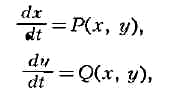 где х и у - переменные состояния системы, Р (х, у) и Q (х, у)- функции, удовлетворяющие условиям теорем существования и единственности решений, f - время (независимая переменная). Поведение такой системы можно представить геометрически на плоскости в прямоугольных декартовых координатах. При таком представлении каждому состоянию динамич. системы однозначно соответствует точка на плоскости с координатами х, у и, наоборот, каждой точке плоскости соответствует одно, и только одно состояние исследуемой динамич. системы. Плоскость О х у наз. фазовой плоскостью. Изменение состояния системы отображается на фазовой плоскости движением точки, к-рую называют фазовой, изображающей или представл я-ющей точкой. Траектория, по к-рой движется изображающая точка, наз. фазовой траекторией; скорость и направление её движения определяются вектором фазовой скорости {Р, Q}. Существенно, что через каждую точку фазовой плоскости проходит только одна фазовая траектория. Совокупность фазовых траекторий наз. фазовым портретом системы и отображает совокупность всех возможных сочетаний системы и типы возможных движений в ней. На фазовой плоскости обычно выделяют следующие три типа фазовых траекторий: особые точки, или положения равновесия, определяемые в результате решения системы ур-ний Р(х, y) = 0, Q(x,