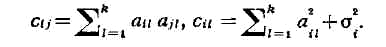 на j-й фактор). Значения аij, bi и ci2 считаются неизвестными параметрами, подлежащими оценке. В указанной форме модель Ф. а. отличается нек-рой неопределённостью, т. к. п переменных выражаются здесь через п + k других переменных. Однако уравнения (*) заключают в себе гипотезу о ковариационной матрице, к-рую можно проверить. Напр., если факторы fj некоррелированы и сij - элементы матрицы ковариаций между величинами Xi, то из уравнений (*) следует выражение для сijчерез факторные нагрузки и дисперсии ошибок: